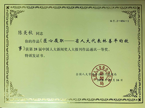 《匠心履職——省人大代表林善平的故事》獲得28屆中國人大新聞獎人大報刊作品通訊一等獎