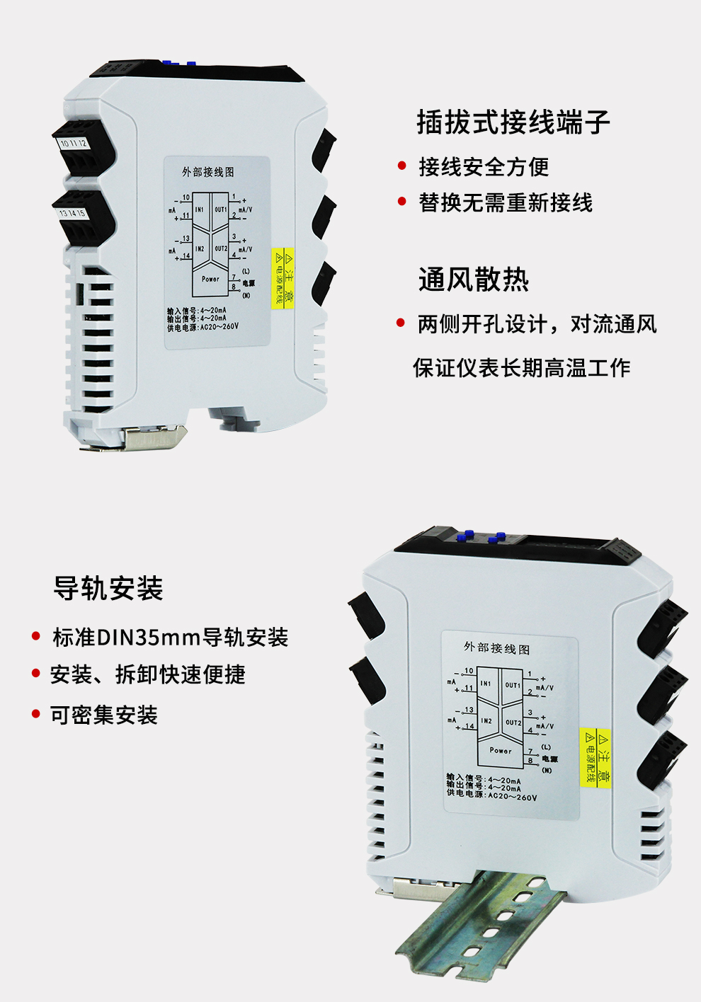 虹潤(rùn)公司是專業(yè)生產(chǎn)隔離器的國(guó)家專精特新“小巨人”企業(yè)。生產(chǎn)的導(dǎo)軌式智能隔離器 ,具有高清顯示單元,參數(shù)可設(shè)置,寬電源供電,響應(yīng)快,帶RS485通訊等特點(diǎn)。產(chǎn)品獲得信號(hào)隔離器、一種二端子模塊、無(wú)源信號(hào)隔離器等3項(xiàng)國(guó)家發(fā)明專利,主持起草現(xiàn)場(chǎng)設(shè)備工具(FDT)接口規(guī)范、工業(yè)過程測(cè)量和控制系統(tǒng)用隔離式安全柵、工業(yè)過程測(cè)量和控制系統(tǒng)用配電器等3項(xiàng)國(guó)家標(biāo)準(zhǔn),以及通信系統(tǒng)多通道數(shù)據(jù)采集控制終端規(guī)范軍用標(biāo)準(zhǔn),參與國(guó)際5G標(biāo)準(zhǔn)制定,取得智能隔離器等2項(xiàng)相關(guān)軟件著作權(quán)。產(chǎn)品廣泛應(yīng)用于電力、石化,冶金、制藥、水處理、機(jī)械配套等各種工業(yè)現(xiàn)場(chǎng)。