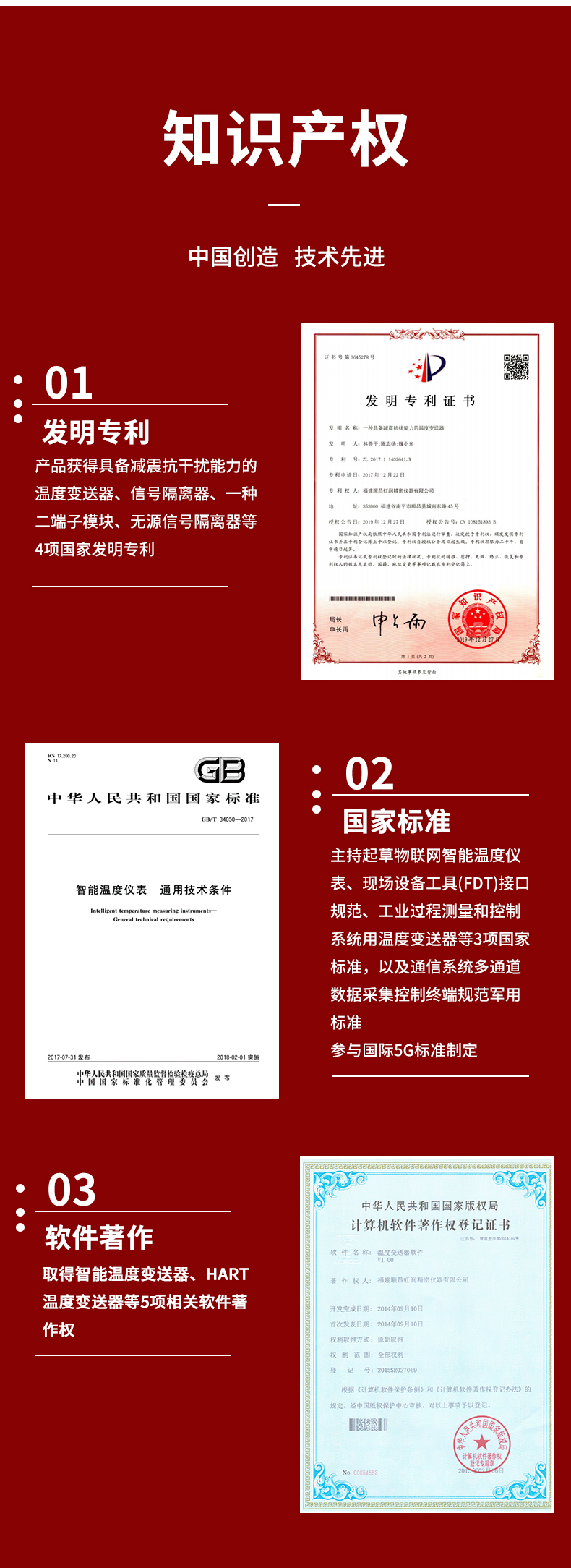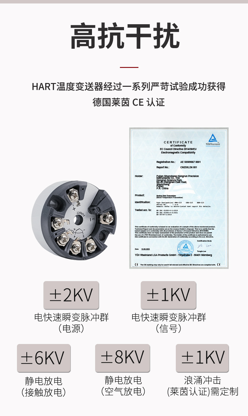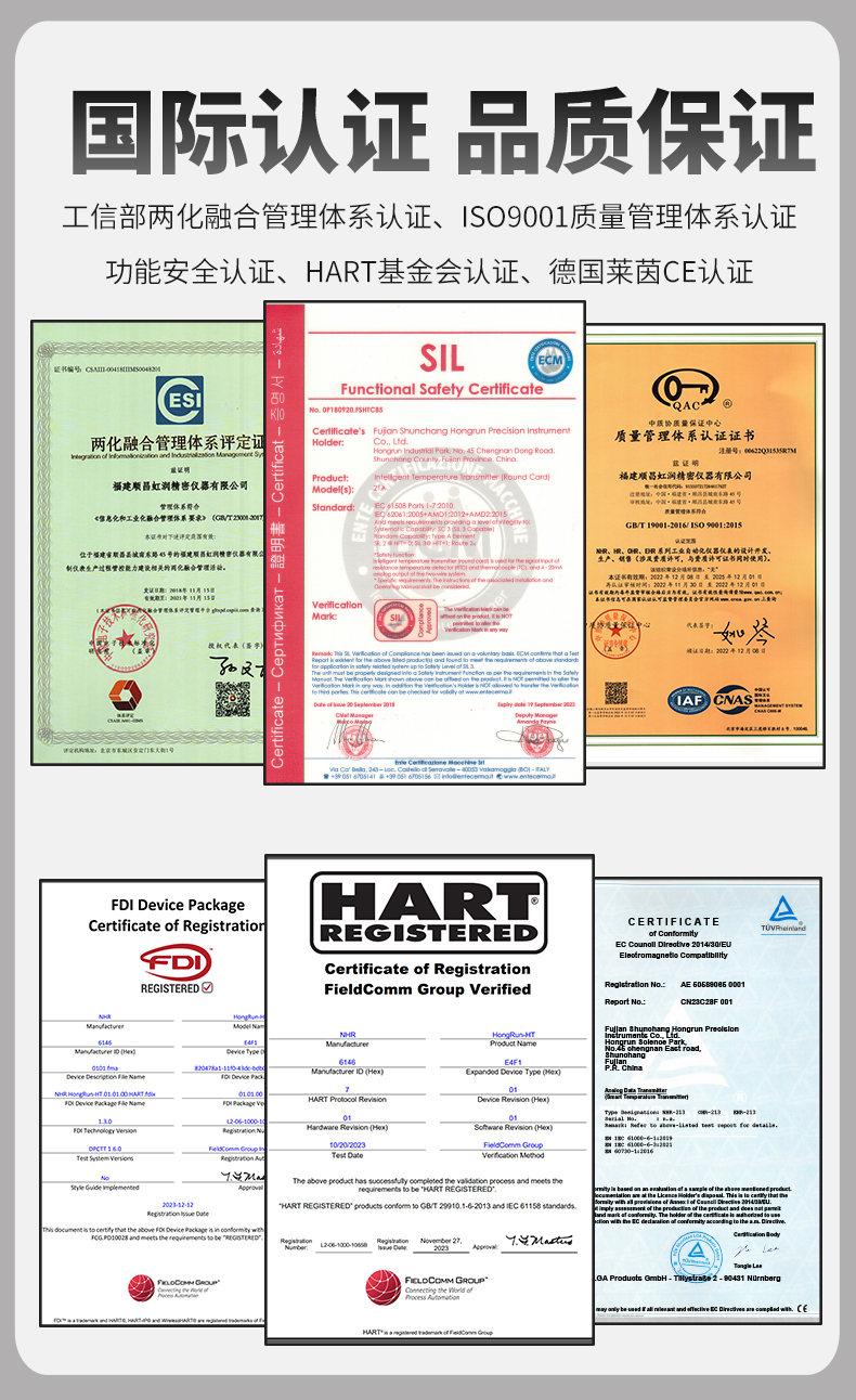 虹潤公司是專業(yè)生產(chǎn)溫度變送器的國家專精特新“小巨人”企業(yè)。生產(chǎn)的智能溫度變送器,具有適配各類溫度傳感器,精度高,穩(wěn)定性好,通過編程線修改輸入信號類型及量程,高抗干擾等特點。該產(chǎn)品不僅通過HART基金會認證、德國萊茵 CE 認證與 SIL 功能安全認證,還獲得具備減震抗干擾能力的溫度變送器、信號隔離器、一種二端子模塊、無源信號隔離器等4項國家發(fā)明專利,主持起草物聯(lián)網(wǎng)智能溫度儀表、現(xiàn)場設(shè)備工具(FDT)接口規(guī)范、工業(yè)過程測量和控制系統(tǒng)用溫度變送器等3項國家標(biāo)準(zhǔn),以及通信系統(tǒng)多通道數(shù)據(jù)采集控制終端規(guī)范軍用標(biāo)準(zhǔn),參與國際5G標(biāo)準(zhǔn)制定,取得智能溫度變送器、HART溫度變送器等3項相關(guān)軟件著作權(quán)。產(chǎn)品廣泛應(yīng)用于石油、化工、電力、冶金、制藥、食品、水處理等各種工業(yè)領(lǐng)域。